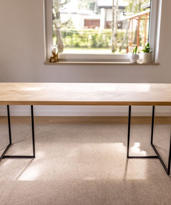 Was diesen Tisch von anderen unterscheidet, ist sein Untergestell. Er ruht auf einem speziellen Dalby-förmigen Bein. Das Dalby-Bein zeichnet sich durch eine besondere Stellung der Beine aus. Es ist eine Kombination aus U-Form mit einem Profil, das einen rechten Winkel mit ihr bildet. Die Tischbeine sind dünn, aber haltbar – sie bilden einen guten Kontrast zur dicken Platte. Die charakteristische Anordnung der Beine ermöglicht es, eine massive Tischplatte zu erhalten. Der Fuß des Tisches ist aus einem Metallprofil mit den Abmessungen von 2x2cm hergestellt. Je nachdem, was Sie brauchen, können Sie aus drei Optionen für die Lackierung der Beine wählen. Die erste ist die matte farblose Lackierung. Die zweite Option ist die mattschwarze Lackierung. Schwarz harmoniert perfekt mit Holzelementen. Und die letzte Option ermöglicht es Ihnen, den Tischfuß in einer beliebigen RAL-Farbe zu lackieren, wodurch Sie die Möbel an das Interieur des Raumes anpassen können.